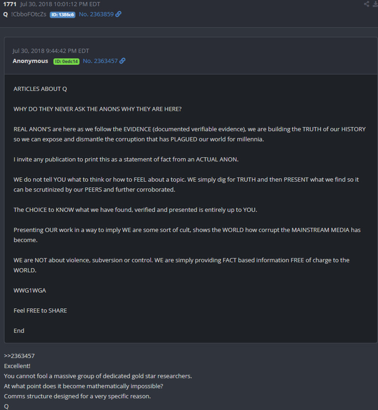 Q responds to an Anon in drop #1771. The Anon discusses the “obvious question” from drop #1770, pointing out the legacy media will not honestly ask real Anons why they follow Q. The Anon expands on the reasons why real Anons followed Q, such as following evidence, building truth of history, sharing truth to expose and dismantle corruption, independent thought, independent feelings, freedom of choice, and peaceful resistance. Q responds to the Anon positively, indicating another valid question and train of thought. Q states that it is hard to fool a massive group of dedicated gold star researchers. That being said, recall when Q told Anons, “We may have overestimated your ability” in drop #178. I still believe that many Anons are missing key pieces of the puzzle, such as Jesus, Bitcoin, and Softwar. Q ends the drop by reminding Anons the comm structure of the drops is designed for a very specific reason. Future proves past!