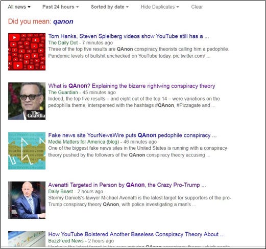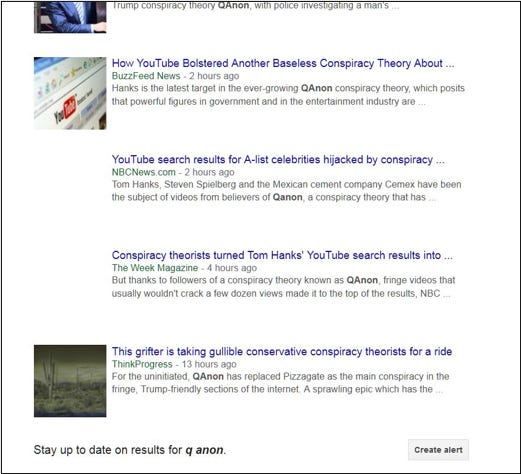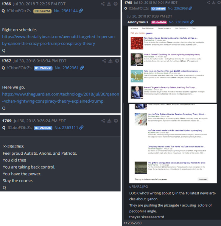 The article continues to media-splain Q, what “QAnon” followers believe, celebrity belief in Q, other people’s belief in Q, and if any of it really mattered. I encourage you to read the full article if you want some chuckles. Q responds to an Anon in drop #1768. The Anon posts a screenshot containing two pictures, each containing a list of then-current “QAnon” search results, titled “qFEAR2.jpg.” The Anon tells others to LOOK at who was writing about Q in the latest articles. The Anon points out the media’s attempt to label “pizzagate” and “accusing actors of pedophilia” narratives as conspiracy theories tied to “QAnon.”