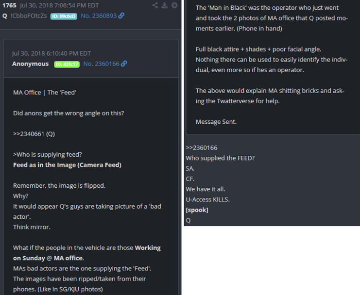Q responds to an Anon in drop #1765. The Anon suggests that Q’s mention of “the feed” was in reference to the camera feed that provided the images from outside Michael Avenatti’s office. The Anon further speculates on the source of the photos and what that could mean. Q responds to the Anon by re-asking the question and stressing FEED, likely indicating the speculation was either partially or wholly off-base. Then, Q indicates Saudi Arabia and Clinton Foundation provided the FEED and re-emphasizes “we have it all.” Q ends the drop by stating unrestricted access to information KILLS and [spook]. We’ll continue to track as we move forward.