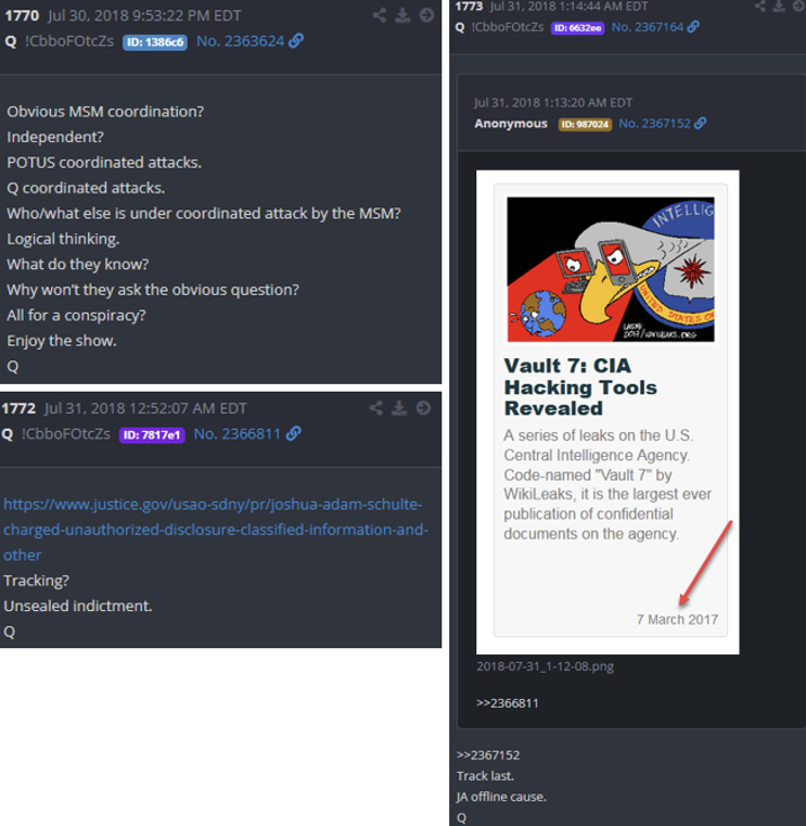 Q responds to an Anon in drop #1773. The Anon re-posts drop #1772 and provides a screenshot of an article discussing the series of Wikileaks on the CIA which was code-named Vault 7. The screenshot highlights the date of March 7, 2017. Q responds to the Anon by asking the cause of Julian Assange being offline, which was Ecuador cutting his internet access from March 2018 to October 2018 and tells Anons to track the latest developments.