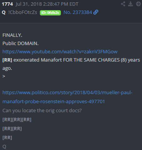 Q provides a YouTube link in drop #1774 and states it is FINALLY in the public DOMAIN. Q clarifies this is in reference to Rod Rosenstein exonerating Manafort FOR THE SAME CHARGES 8 years prior. “Rod Rosenstein exonerated Paul Manafort of the crime he is being put on trial for. Paul Manafort's attorneys are probably going to put Rosenstein on the stand!”